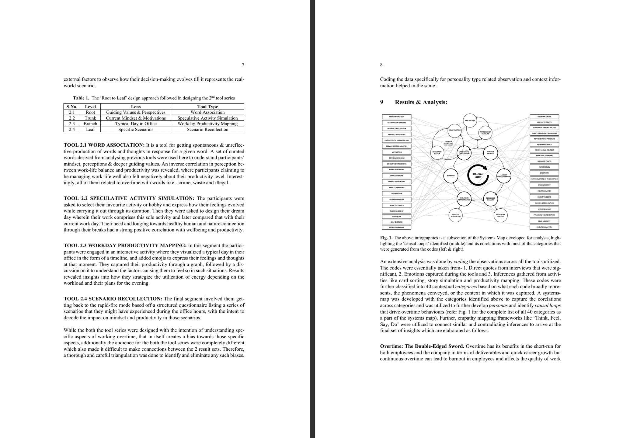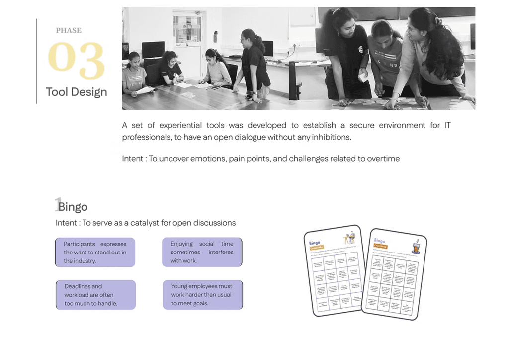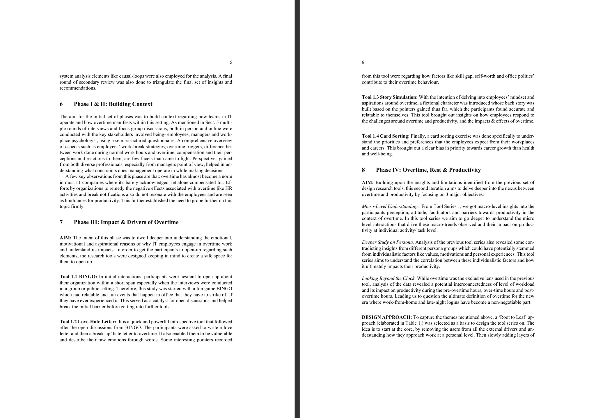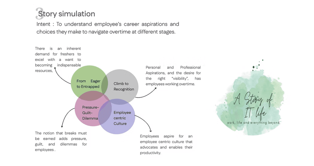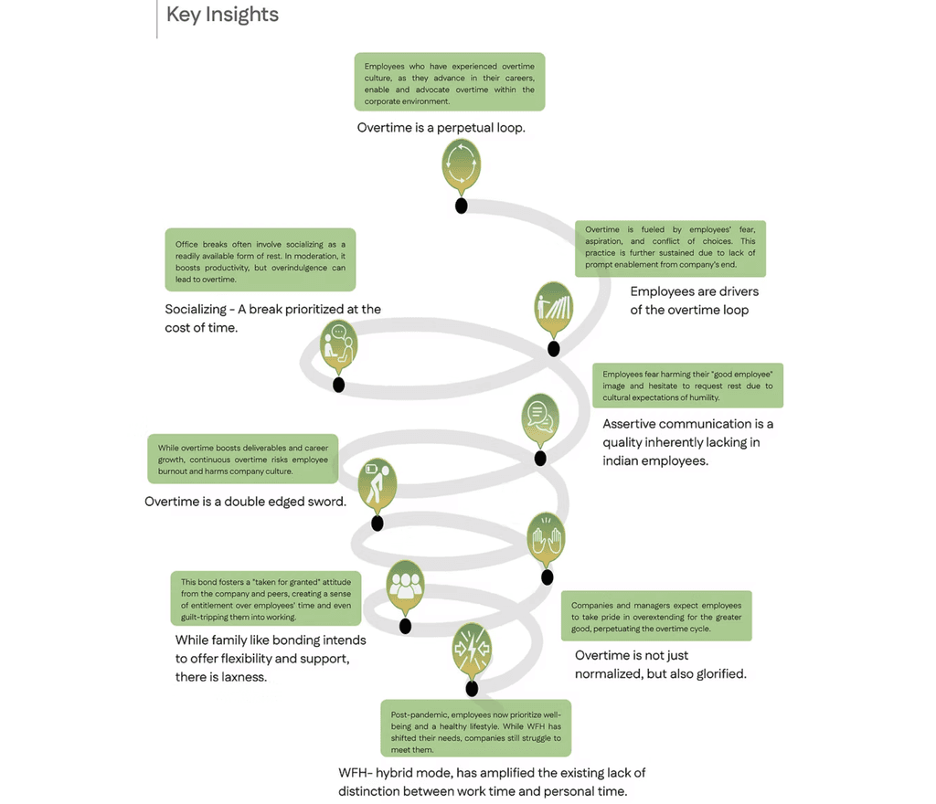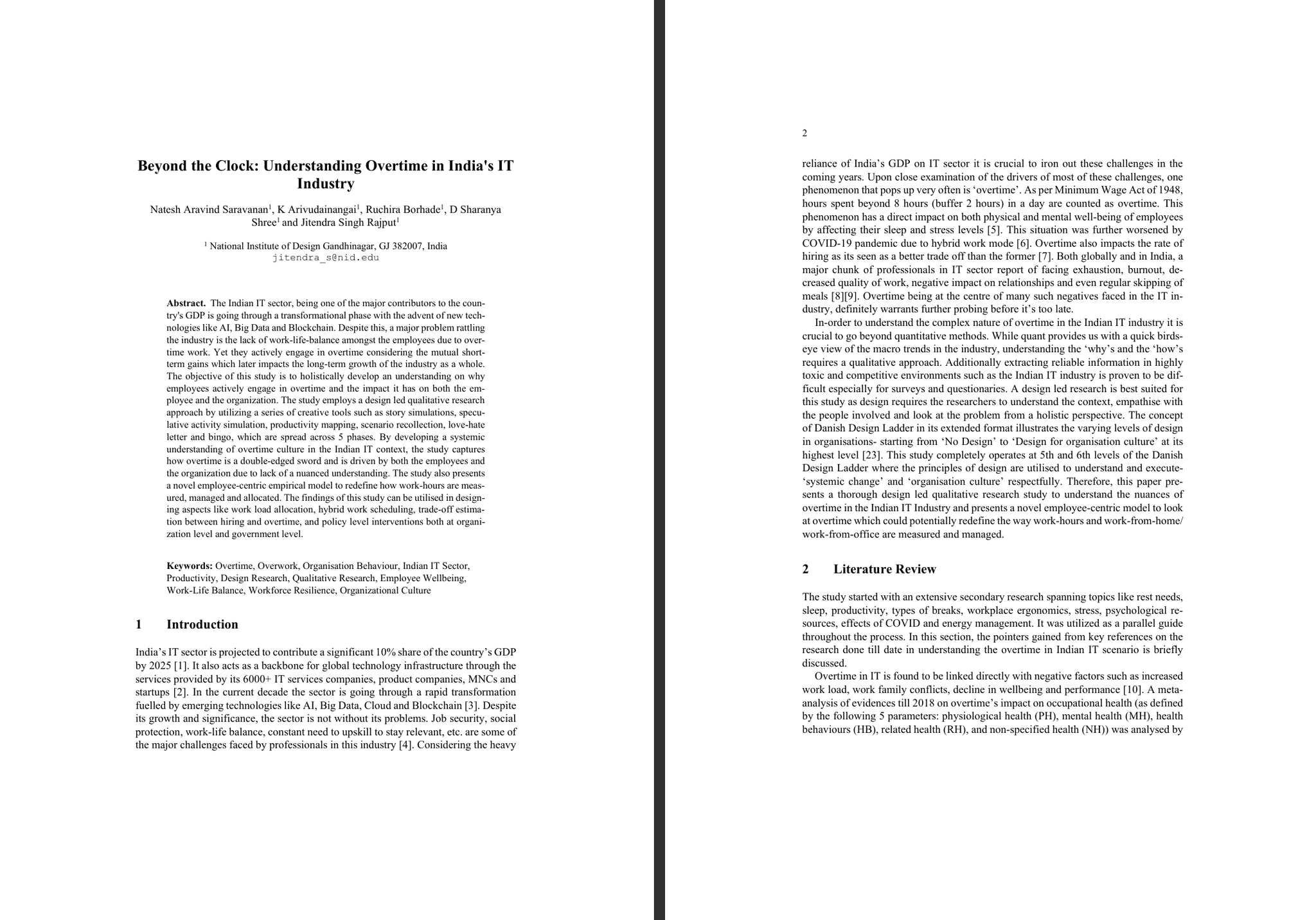 The objective of this study is to holistically develop an understanding on why employees actively engage in overtime and the impact it has on both the em ployee and the organization. The study employs a design led qualitative research approach by utilizing a series of creative tools such as story simulations, specu lative activity simulation, productivity mapping, scenario recollection, love-hate letter and bingo, which are spread across 5 phases. By developing a systemic understanding of overtime culture in the Indian IT context, the study captures how overtime is a double-edged sword and is driven by both the employees and the organization due to lack of a nuanced understanding.