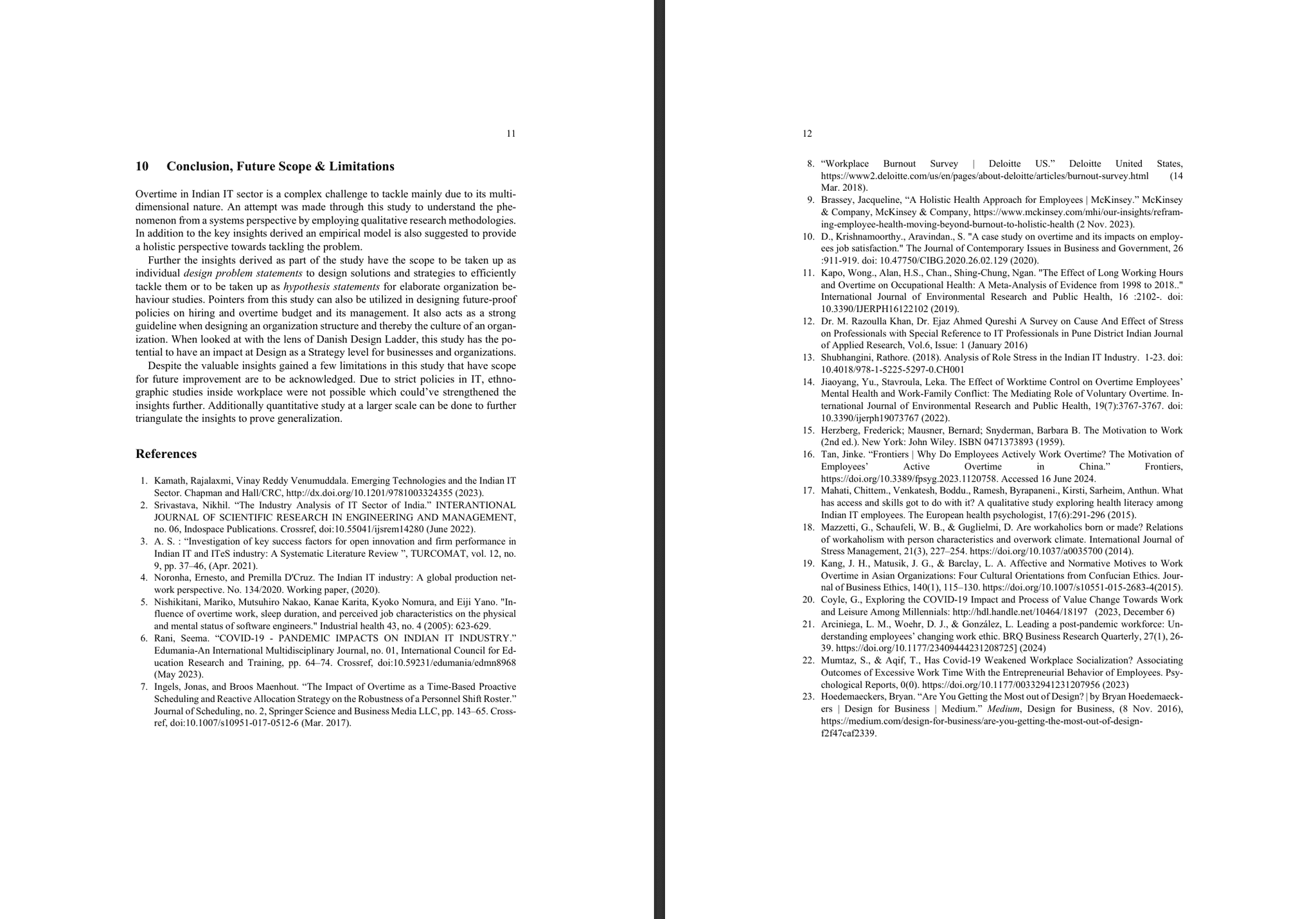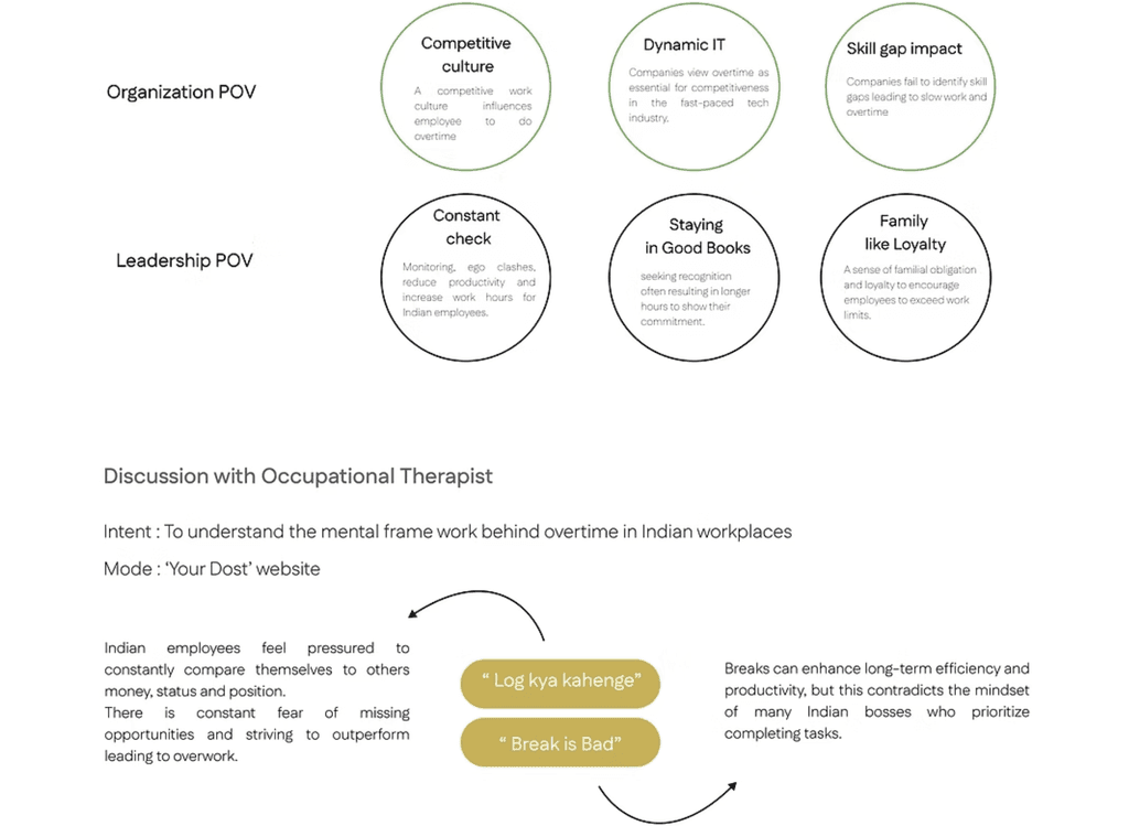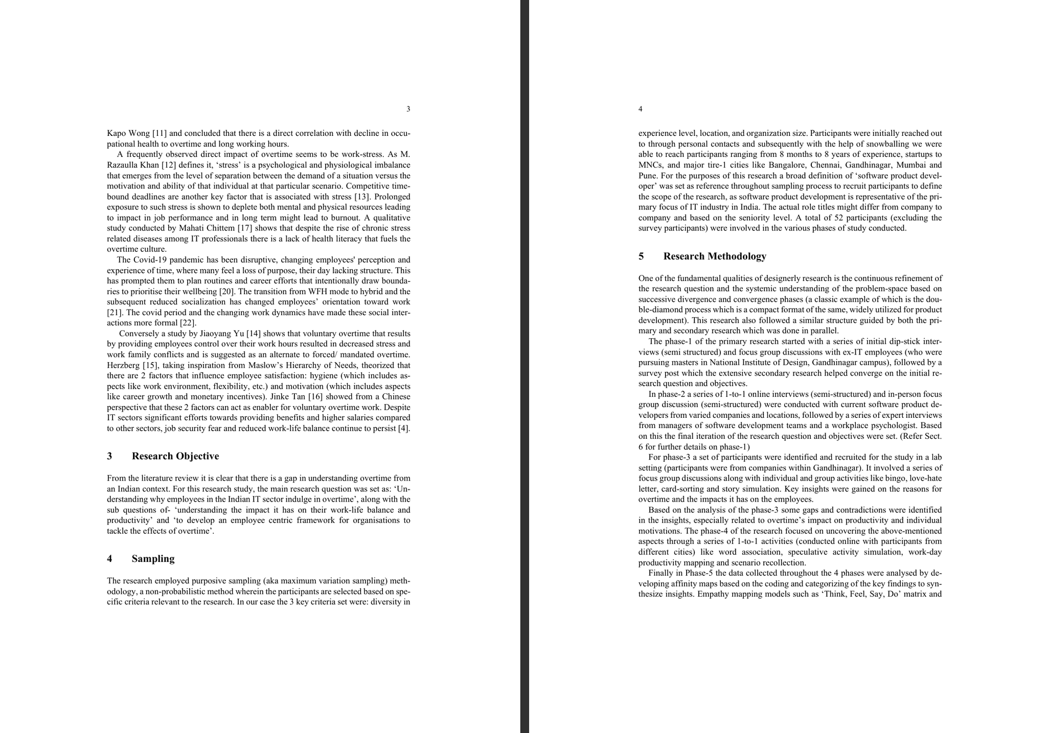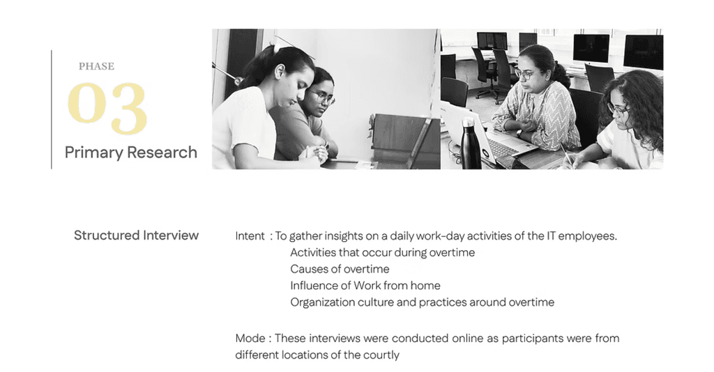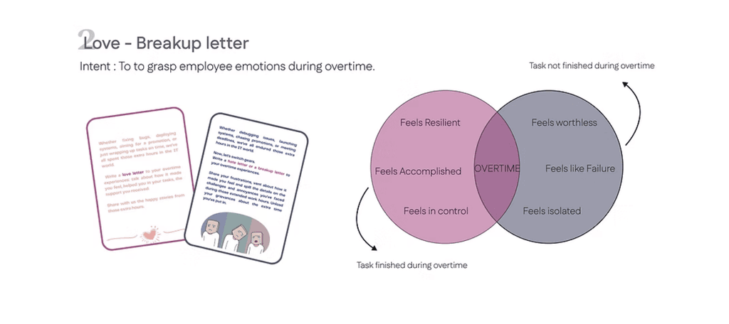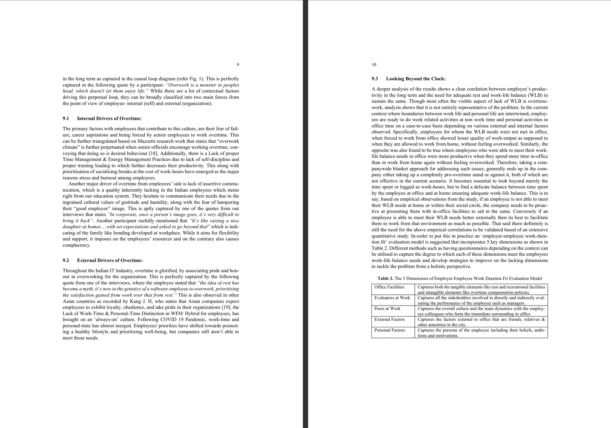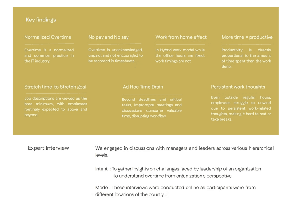 The objective of this study is to holistically develop an understanding on why employees actively engage in overtime and the impact it has on both the em ployee and the organization. The study employs a design led qualitative research approach by utilizing a series of creative tools such as story simulations, specu lative activity simulation, productivity mapping, scenario recollection, love-hate letter and bingo, which are spread across 5 phases. By developing a systemic understanding of overtime culture in the Indian IT context, the study captures how overtime is a double-edged sword and is driven by both the employees and the organization due to lack of a nuanced understanding.