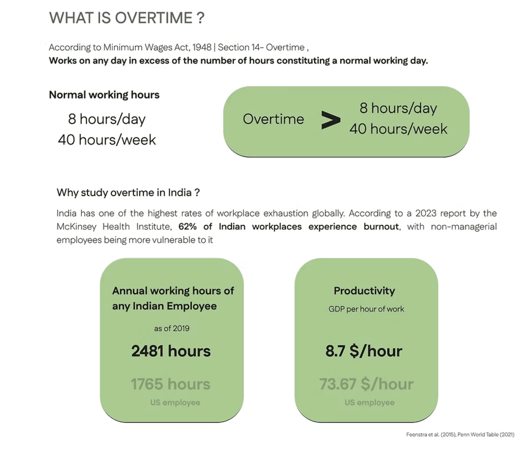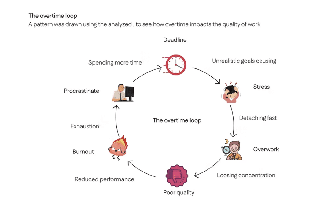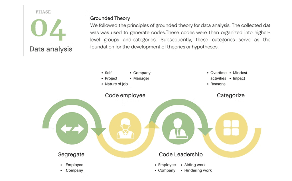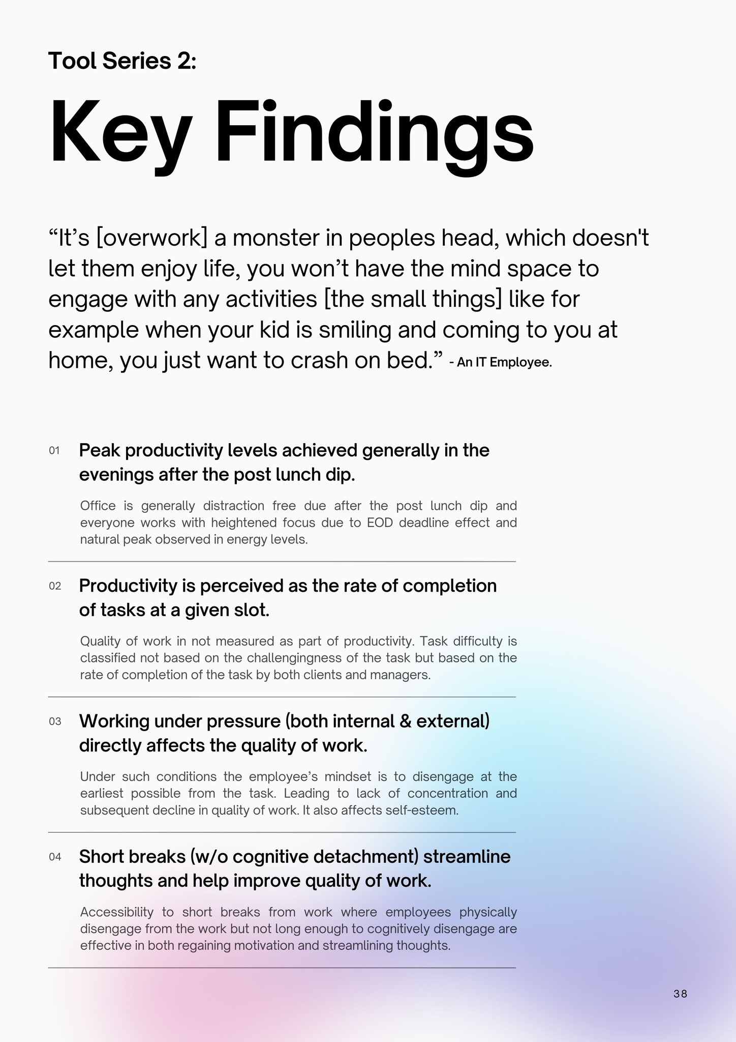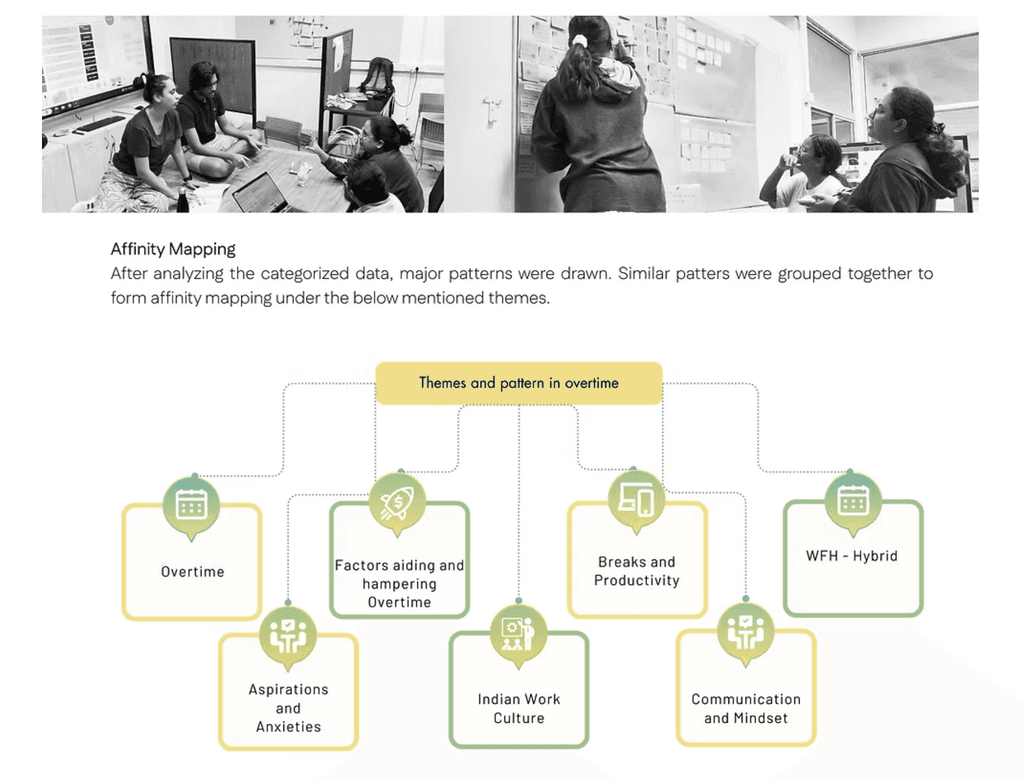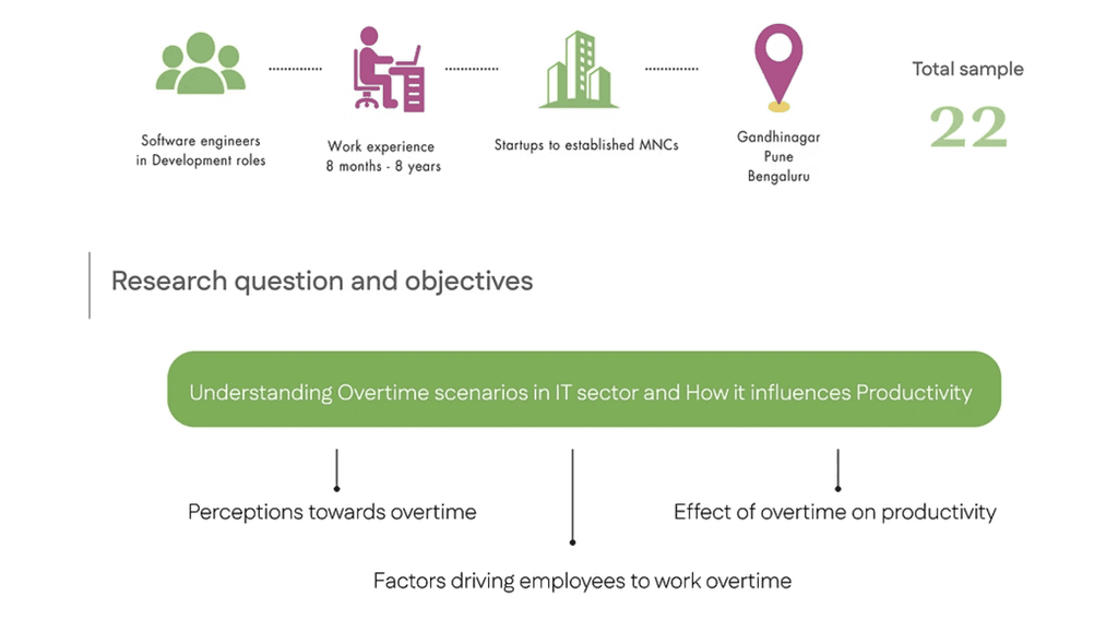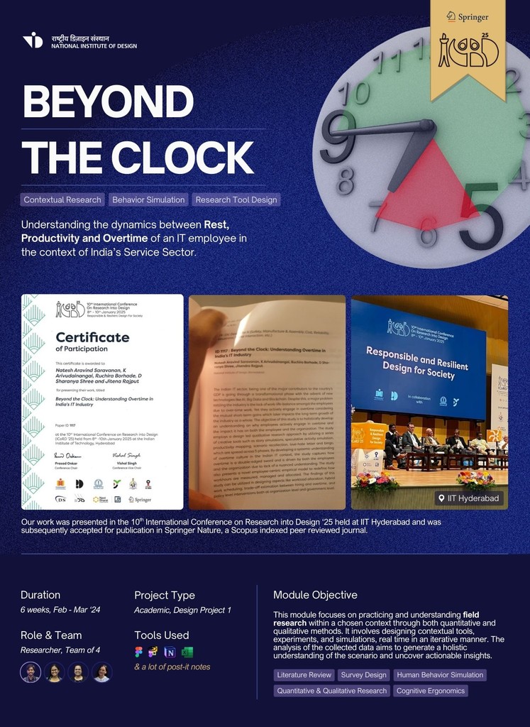 The objective of this study is to holistically develop an understanding on why employees actively engage in overtime and the impact it has on both the em ployee and the organization. The study employs a design led qualitative research approach by utilizing a series of creative tools such as story simulations, specu lative activity simulation, productivity mapping, scenario recollection, love-hate letter and bingo, which are spread across 5 phases. By developing a systemic understanding of overtime culture in the Indian IT context, the study captures how overtime is a double-edged sword and is driven by both the employees and the organization due to lack of a nuanced understanding.