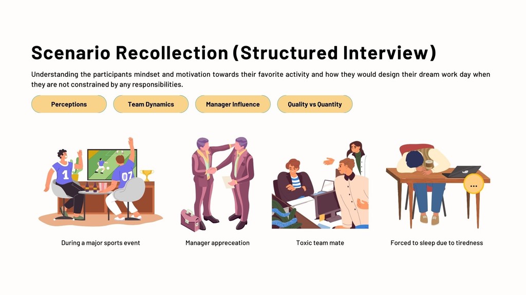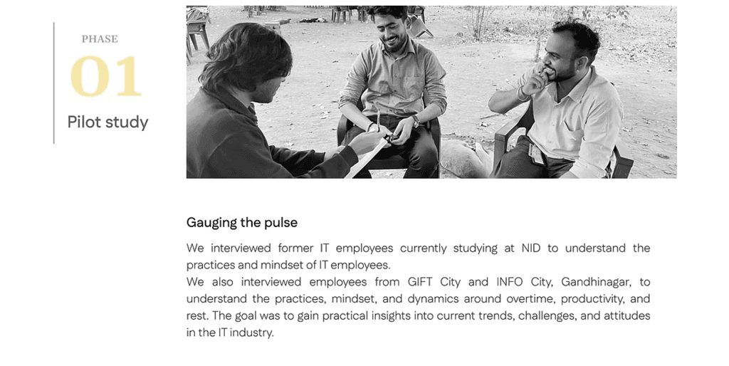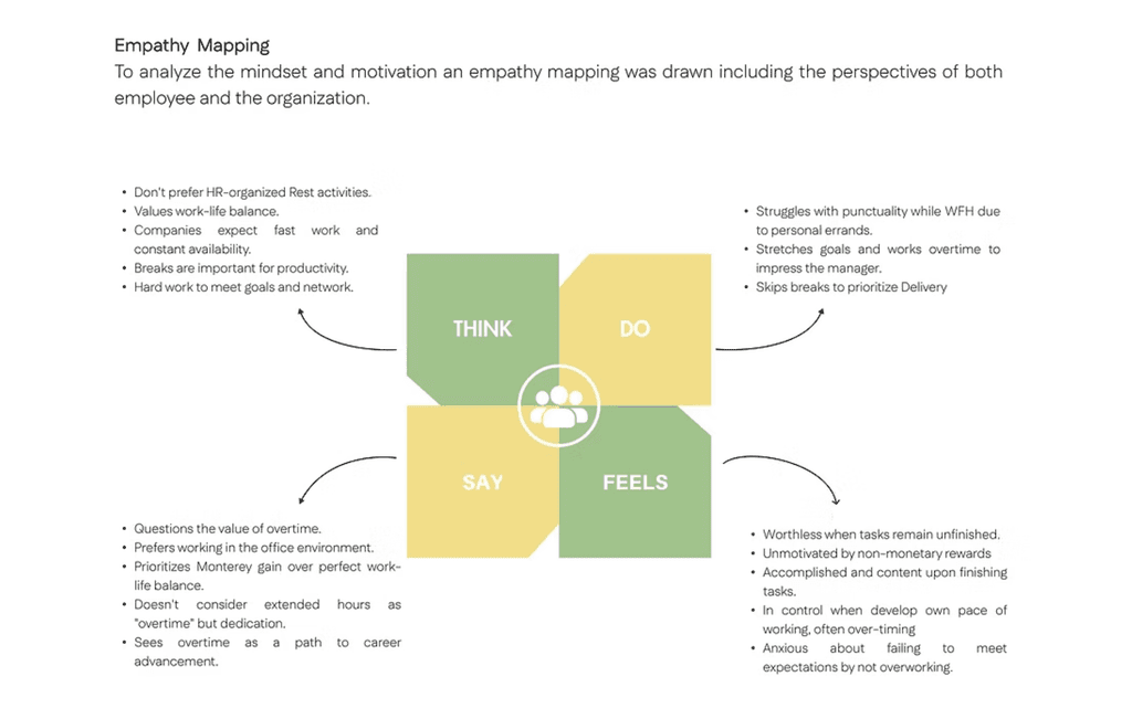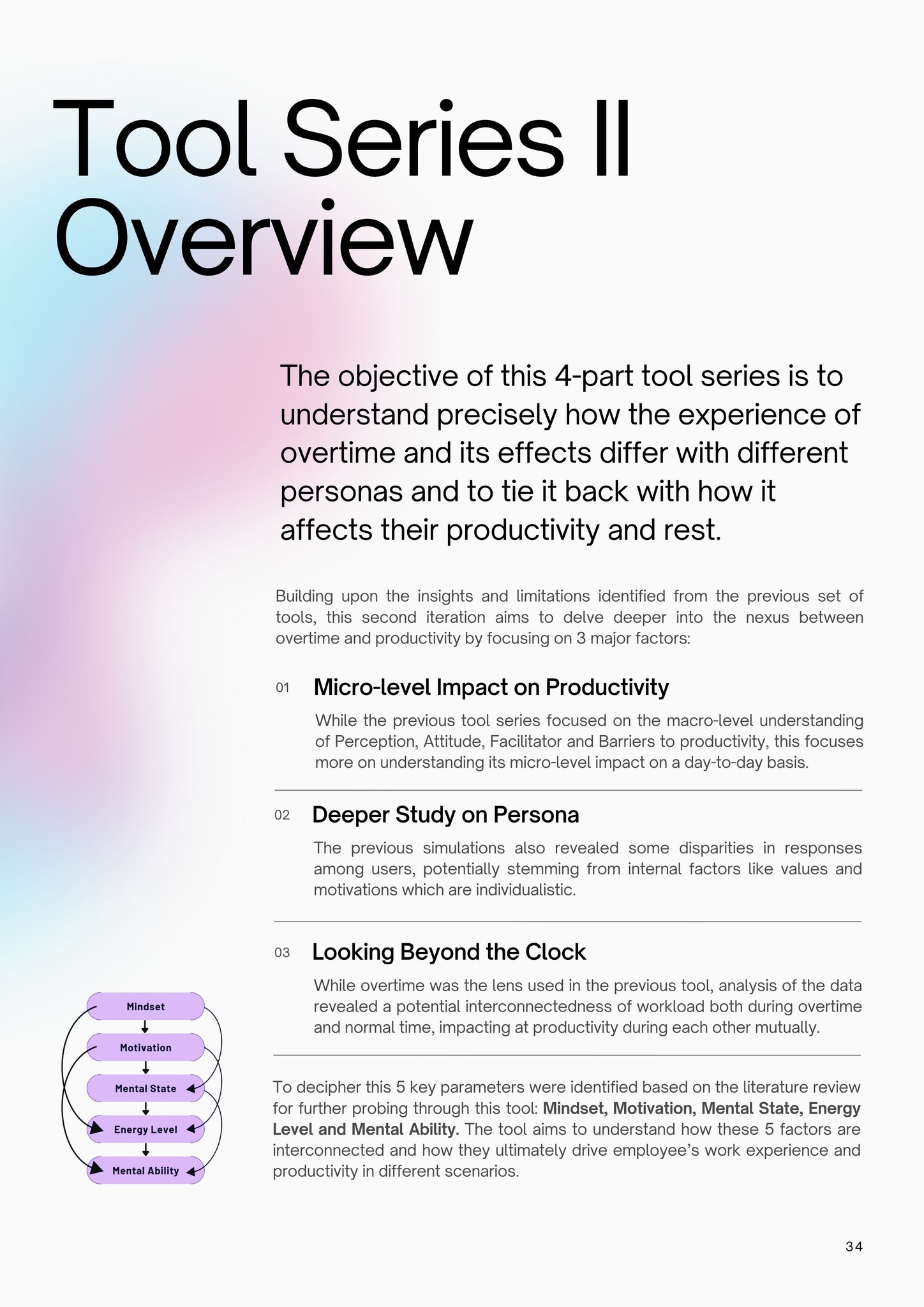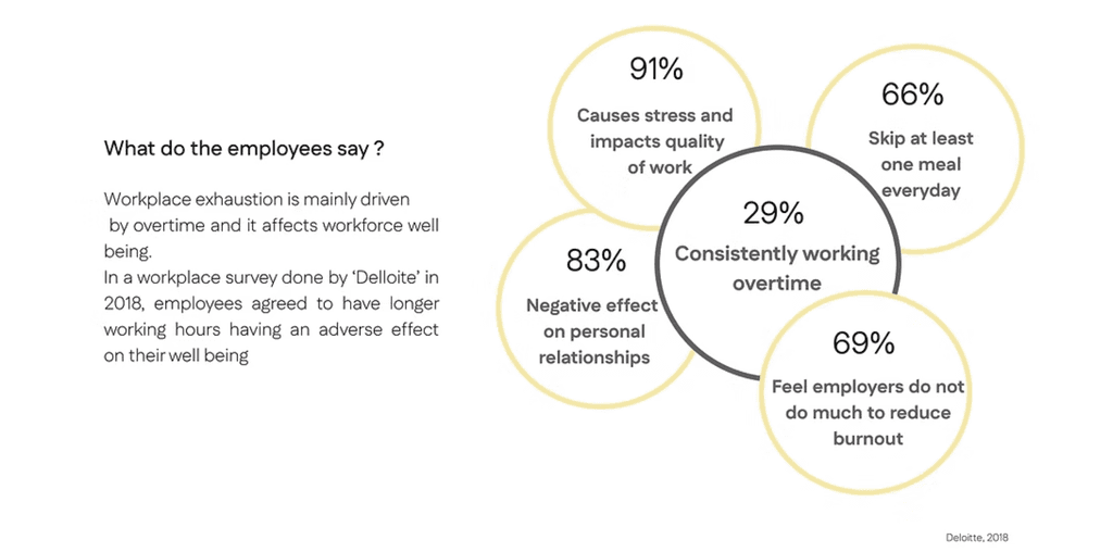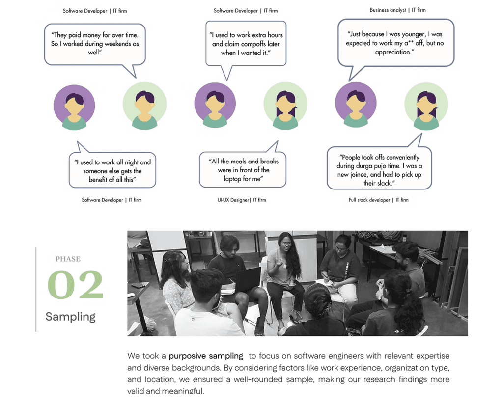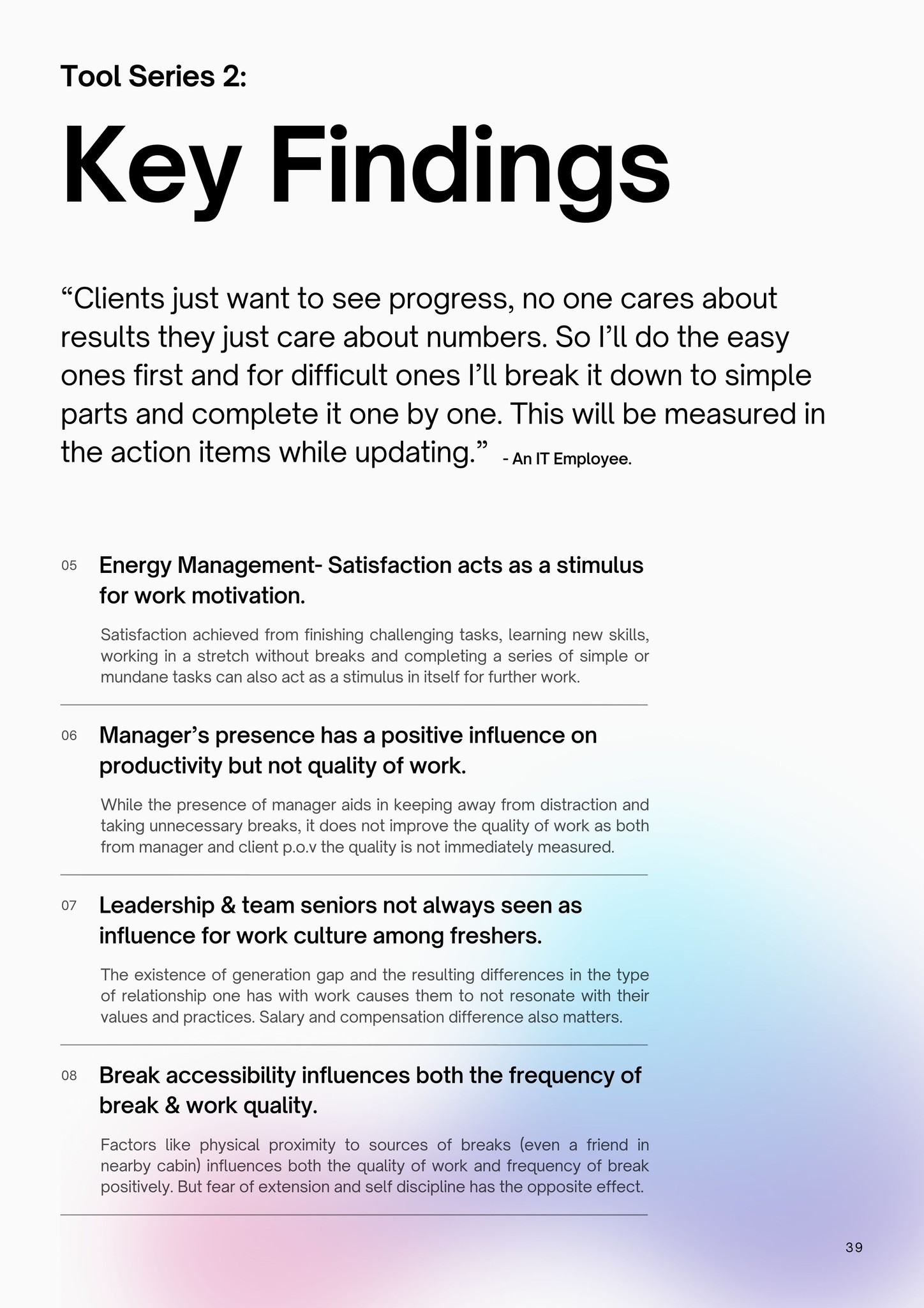 The objective of this study is to holistically develop an understanding on why employees actively engage in overtime and the impact it has on both the em ployee and the organization. The study employs a design led qualitative research approach by utilizing a series of creative tools such as story simulations, specu lative activity simulation, productivity mapping, scenario recollection, love-hate letter and bingo, which are spread across 5 phases. By developing a systemic understanding of overtime culture in the Indian IT context, the study captures how overtime is a double-edged sword and is driven by both the employees and the organization due to lack of a nuanced understanding.